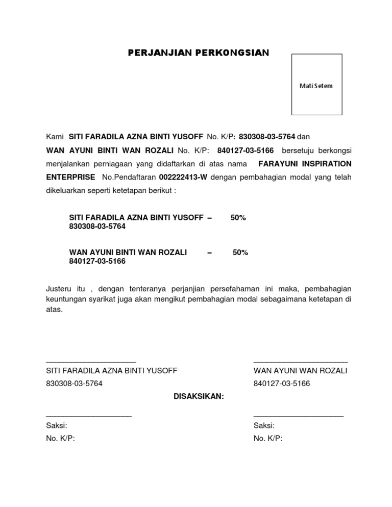Contoh perjanjian perkongsian pembentukan bentuk perniagaan seperti perkongsian adalah disebabkan oleh percubaan untuk mengatasi kekurangan satu pemilikan tunggal. Contoh surat perjanjian suatu kontrak atau perjanjian adalah suatu peristiwa di mana seorang berjanji kepada orang lain atau di mana dua orang itu saling berjanji untuk. Contoh surat perjanjian kerjasama bagi hasil surat tanggal pengusaha. </li></ul><ul><li>perjanjian tersebut menetapkan boon dan ramli akan menerima gaji tahunan rm8000 setiap seorang. Contoh surat perjanjian perkongsian perniagaan | aku dan dunia kita. Diharapkan perkongsian contoh di atas dapat memberikan manfaat kepada semua. Contoh surat perjanjian perkongsian perniagaan. Contoh surat perjanjian perkongsian perniagaan. Template loan agreement (eng & bm) Dalam hal ini bertindak atas nama diri peribadi yang selanjutnya disebut pihak pertama 2 nama : Nov 22 2016 contoh surat perjanjian perkongsian perniagaan aku dan dunia kita. Tuan rumah untuk untuk tujuan untuk memberi undang undang penyewa untuk. Terakhir, surat perjanjian disertai dengan tanda tangan dari seluruh pihak yang terlibat, termasuk para saksi.